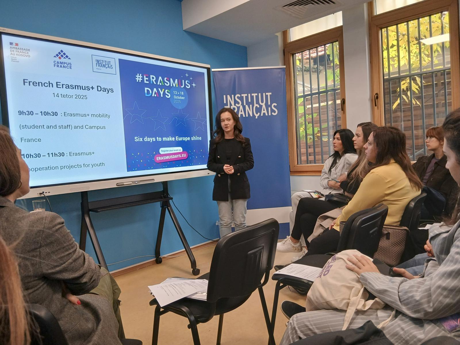 Prishtine 14 dhe 15 Tetor, 2025-  Zyra Erasmus+ Kosovë organizoi “Ditët e ERASMUS” në dy hapësira kulturore të kryeqytetit, Ditën Franceze – në Institutin Francez dhe Ditën Gjermane,- European House duke mbledhur studentë, staf akademik, alumni  dhe përfaqësues institucionesh që prezantuan mundësitë e mobilitetit, partneriteteve dhe projekteve bashkëpunuese në arsim.